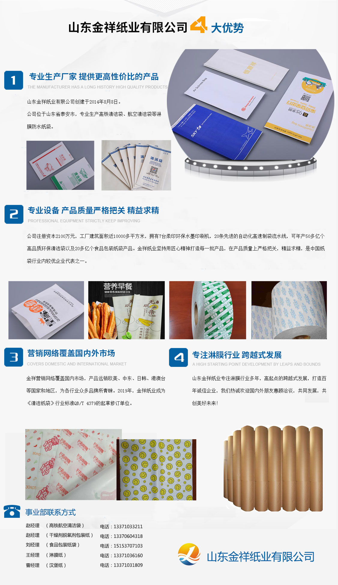 山東金祥紙業(yè)有限公司創(chuàng)建于2014年8月8日,公司位于山東泰安,專業(yè)生產(chǎn)高鐵清潔袋、航空清潔袋等淋膜防水紙袋。公司注冊資本2100萬元,工廠建筑面積近10000多平方米,擁有7臺柔印環(huán)保水墨印刷機(jī),20條先進(jìn)的自動(dòng)化高速制袋流水線,可年產(chǎn)50多億個(gè)高品質(zhì)環(huán)保清潔袋以及20多億個(gè)食品包裝紙袋產(chǎn)品。金祥紙業(yè)堅(jiān)持用匠心精神打造每一批產(chǎn)品,在產(chǎn)品質(zhì)量上嚴(yán)格把關(guān),精益求精,是中國紙袋行業(yè)內(nèi)較優(yōu)企業(yè)代表之一。金祥營銷網(wǎng)絡(luò)覆蓋國內(nèi)市場,產(chǎn)品遠(yuǎn)銷歐美、中東、日韓、港澳臺等國家和地區(qū),為各行業(yè)眾多品牌所青睞。2019年,金祥紙業(yè)成為《清潔紙袋》行業(yè)標(biāo)準(zhǔn)QB/T 4379的起草修訂單位。